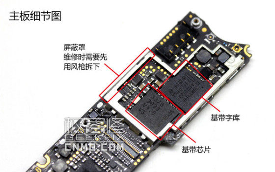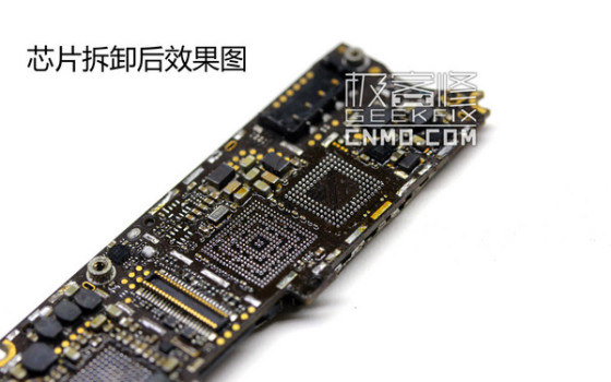 2、需要替换的就是基带芯片和基带字库,首先用风枪将屏蔽罩取下,然后再拆卸芯片。(操作方法可参考《极客修:砖机之殇 字库损坏该如何维修?》)