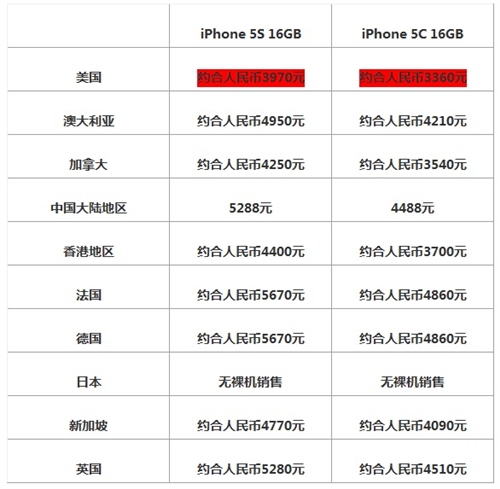如果想要第一时间稳准狠的买到便宜的5C/5S,首先你要知道哪里卖的最便宜!苹果公布的首批iPhone 5C、5S上市名单中,一共涉及了9个国家10个地区,我们以16GB为例,首先来看看裸机的售价哪个地区最便宜,请看下表:
