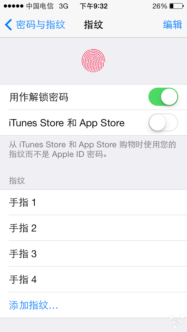建议大家把左右手的拇指和食指都设置了,学长只设置了两个拇指,还有两个不是学长的,被学姐拿去设置了,美其名曰:要是你手指受伤了,我可以帮你开手机,呵呵......不过多设置一个人也是有好处的,手机拉寝室里,至少有个同学可以帮你打开,但是可以不知道你的开机密码。苹果的初衷就是为了减少输入密码,但是学长发现,在屏幕黑待机下,按HOME键唤醒,手感比较生硬,按完需要贴着HOME键验证指纹,操作不是很连贯,如果你一直按住HOME键,不是验证指纹而是启动了SIRI,调用多任务的时候,学长经常贴着HOME键,用验证指纹的方法启动多任务,一会才明白这货是需要按两下,看来要流畅操作真的需要一段时间适应。
