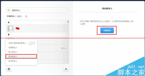 4、点击之后,找到“导出联系人”选项,点击,右侧将会显示出导出联系人的界面,点击“开始导出”即可进行导出操作;导出联系人的格式为vCard格式,这是一个几乎通用的联系人备份方式,这个格式的备份可以导入苹果的iClound云服务的通讯录中。
