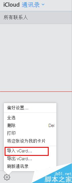 6、点开通讯录,在左下角找到齿轮一样的菜单设置键,单击之后,点击“导入vCard...”选中之前我们备份的vCard文件,即可导入了;之后我们只需要在iphone上登录AppleID,即可同步过来联系人信息了。