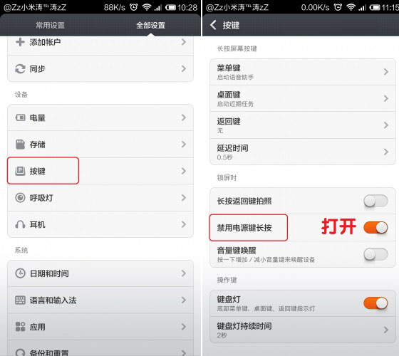 同样是在小米3全部设置中,我们找到“按键”设置,进入按键设置后,里面有一项“禁用电源键长按”,我们将该功能开启,即可时间禁用长按电源键关机了,如下图所示: