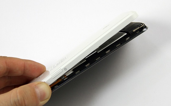 中兴青漾2并没有采用一体机身设计,而是采用可拆卸后盖设计,因此拆机第二步就是拆开手机后壳。需要注意的是中兴青漾2后盖材质较薄并且非常紧,因此拆后盖的时候需要比较细心,不要过于用力,如下图所示: