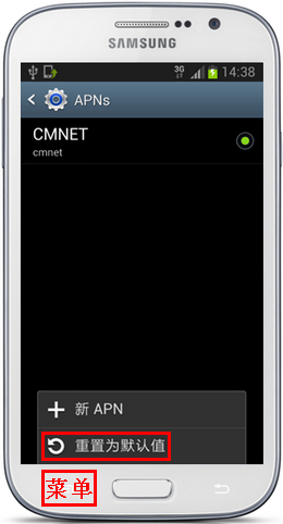 9.点击左下方的【菜单】键,选择【重置为默认值】。设置完成后,重启手机即可进行上网。