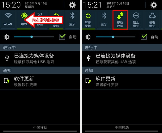 3.向左滑动屏幕上方的任务栏,把【移动数据】点为绿色。