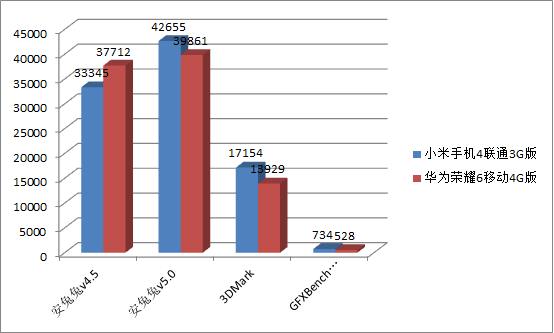 我们采用安兔兔4.5、安兔兔5.0、3DMark和GFXBench这四款软件来对这两款手机进行测试,每种测试软件我们分别运行5遍,并取这5遍的平均值进行对比。