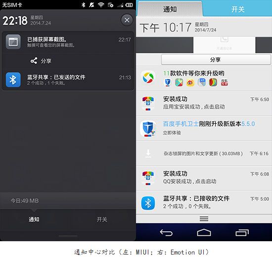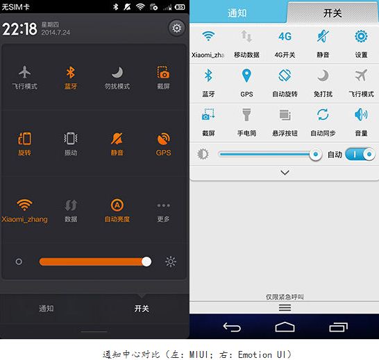 MIUI布局鲜明、操作方便的通知中心,Emotion UI的通知中心就过于简陋了,各类图标和其他深度定制系统也有明显的差距。