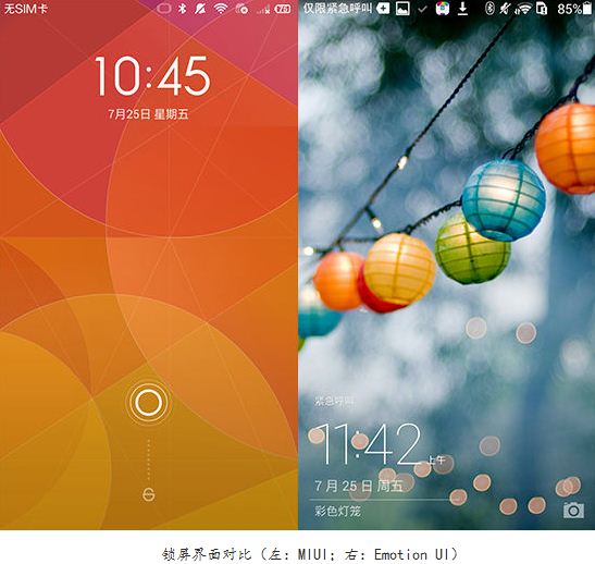 在锁屏界面上,MIUI则基本沿用了原生Android系统的解锁方式,Emotion UI从左右两侧向内滑动即可解锁的方式。值得一提的是,Emotion UI有一个“主题”图标,内有各种不同的主题,已经有上百种可以选择,这个够新鲜。