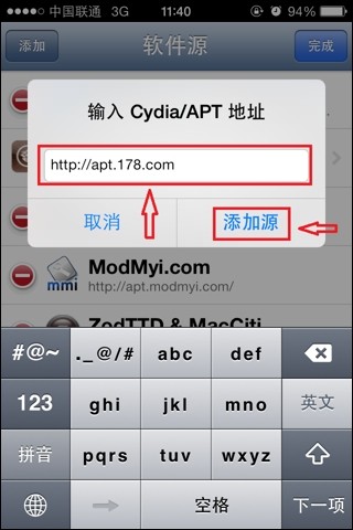 3、然后我们在输入框内输入【httr://apt.178.com】后点击【添加源】;