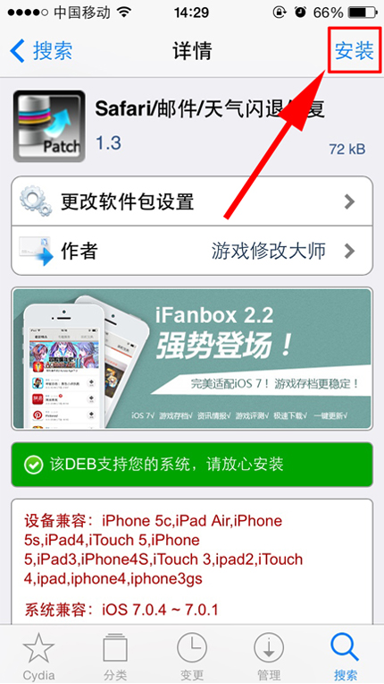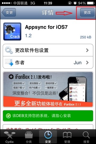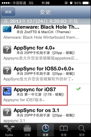 打开设备上的cydia--管理--软件包--找到ipa补丁(Appsync for iOS7 )后卸载