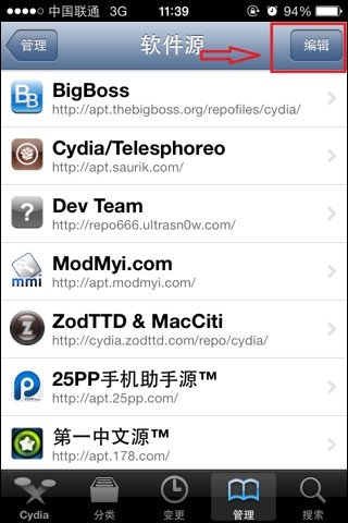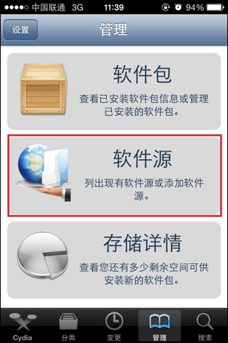 1、首先,我们打开桌面上的Cydia,进入以后选择【管理】,然后点击【软件源】;