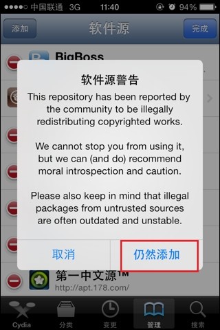 4、当我们选择添加源后,会弹出一个提示框,点击【任然添加】,然后等待添加完成后点击【返回Cyida】就可以了;