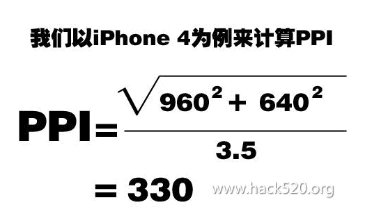 iPhone 4 PPI为330是如何计算出来的呢?我也不知道,就去网上寻找答案,好像还真不好找,不过还是找到了。PPI是英文Pixels per inch的缩写,意思就是每英寸所拥有的像素(Pixel)数目,搞清楚了PPI是什么意思,我们就能很容易理解PPI的计算方式了,我们需要首先算出手机屏幕的对角线等效像素,然后除以对角线(我们平常所说的手机屏幕尺寸就是说的手机屏幕对角线的长度),就可以得到PPI了。准确的计算公式大家可以参照下图: