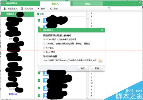 2、360手机助手连接成功手机后,点击360手机助手的“联系人”,接着点击需要导出的电话的联系人,点击360手机助手的“导入/导出”,然后会出现导出的各种格式,选择好自己需要导出的格式与保存位置点击“确定”即可成功导出!