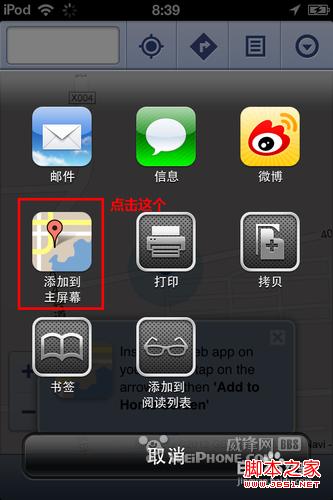 6.能找到一个地图图标,名字为“添加为主屏幕”,点击之。