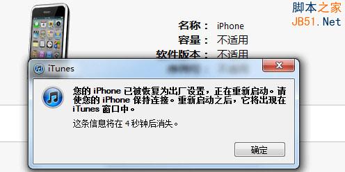 恢复完成之后,iTunes会提示“iPhone恢复出厂设置,并将重启”