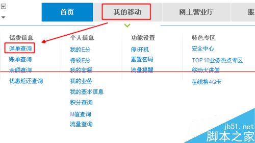 2、成功登录网站后点击“我的移动”选择“详单查询”