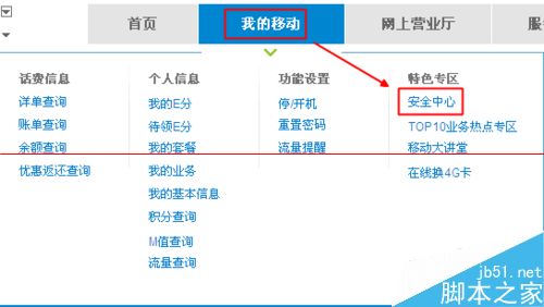 2、同样我们先点击“我的移动”接着选择“安全中心”