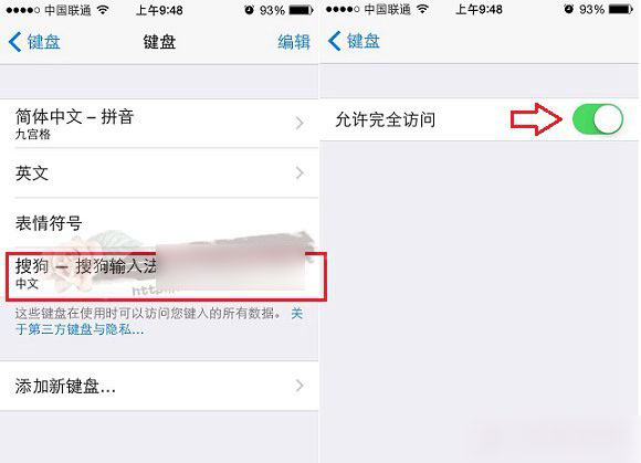 三、如果你此前安装了百度输入法、搜狗输入法,那么在这里就可以找到,我们点击第三方输入法,将其添加到iOS8输入法中来即可。这里以添加搜狗输入法为例,添加完成后,在iOS8键盘设置中,就可以看到了,之后再点击进入,将其权限设置为“完全允许”,如下图所示。