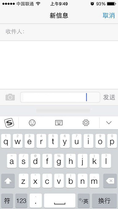 四、至此,iOS8输入法设置就完成了,我们可以打开一个短信文字发送框,输入文字试试,之后就可以看到,默认输入法变成了搜狗输入法了,如下图所示。