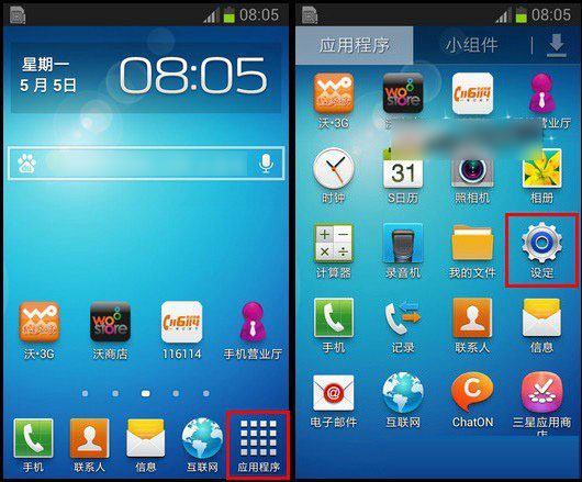 1、进入三星手机桌面界面,然后点击进入【应用程序】,之后在进入【设定】,如下示意图所示。