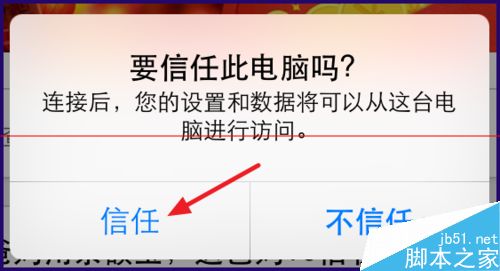 1、将iPhone连接到电脑后,iPhone上会有一个对话框,在对话框内点击【信任】