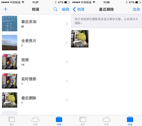 照片分享:只是UI变化。(左为iOS 7,中、右为iOS 8)