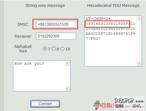 在SMSC框中输入你的短信中心号码,然后点下面的Convert,则PDU格式会在右边框中生成,然后取前18位,如我的短信中心号码的PDU格式为:0891683108501505F0,再把这18位字符输入到手机中的SMSC框中,点后面的“更新”。
