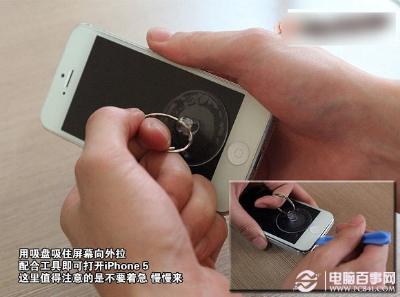 三、当iPhone固定螺丝拆卸完之后,我们需要用吸盘吸住屏幕,然后向外拉。配合工具即可打开iPhone5,如下图所示: