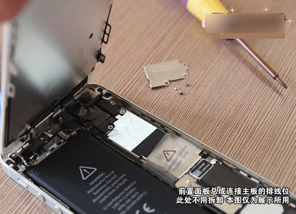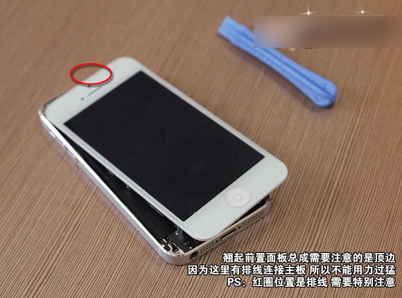 四、通过一番努力与仔细拆卸,翘起前置面板总算打开了,这里需要注意的是,iPhone5顶部位置有排线与主板连接,所以一定要注意,别用力过猛,以免扯断排线。