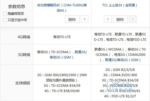 网络制式方面,小编手上的荣耀畅玩4C是移动4G版,支持双卡双待,但是不支持双4G。TCL么么哒3S则厚道很多,不但双卡双待,还支持电信3G/4G网络,丝毫不输于其它全网通手机。