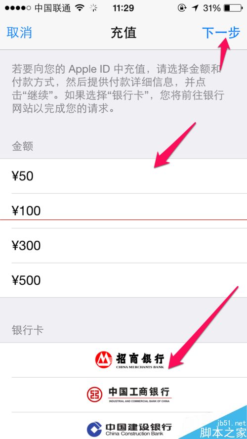 5、选择充值金额,选择付款银行,再点击下一步。