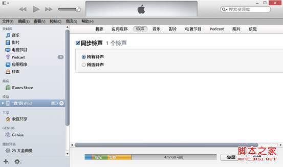 将 iPhone 设备连接 iTunes,点击设备,找到铃声选项卡,选择“所有铃声”,点击“应用”,同步完成后即完成了铃声文件的添加。