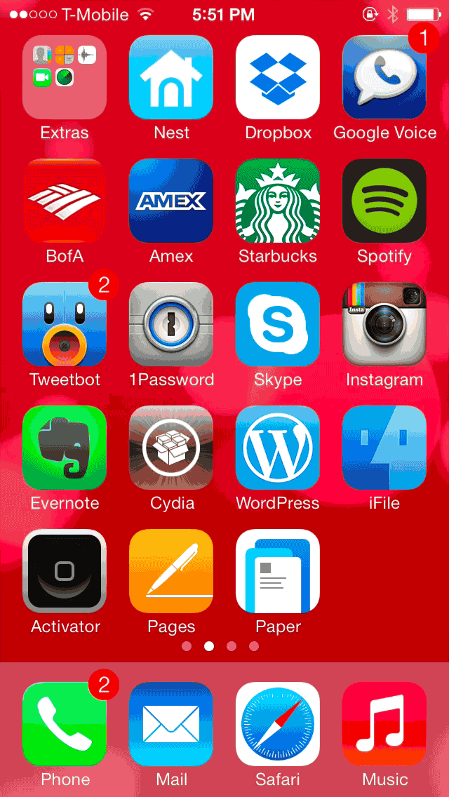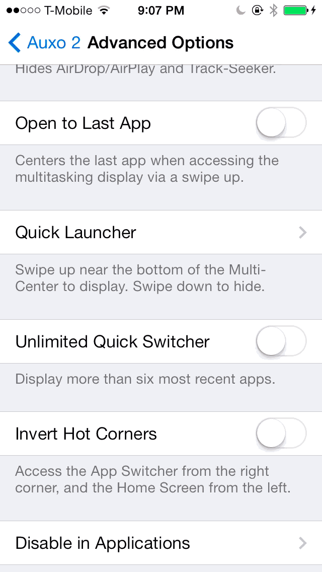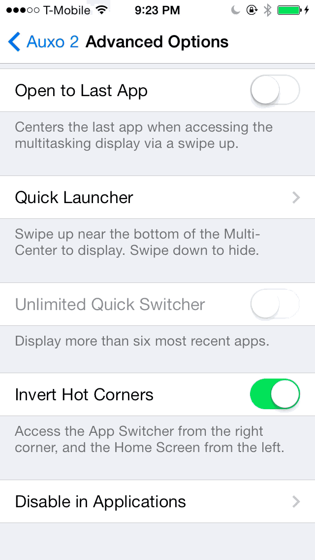 zephyr相信各位都还记得并无限怀念吧,iOS6时代火到一塌糊涂的快捷从屏幕底部上拉退出app插件,AUXO 2完美移植了该功能,让你可以找回久违的爽快便捷感,开启手势是从屏幕右下角上拉,注意这个功能并没有彻底关闭应用App,它依然在后台运行,只是让你更快速进入主屏幕。