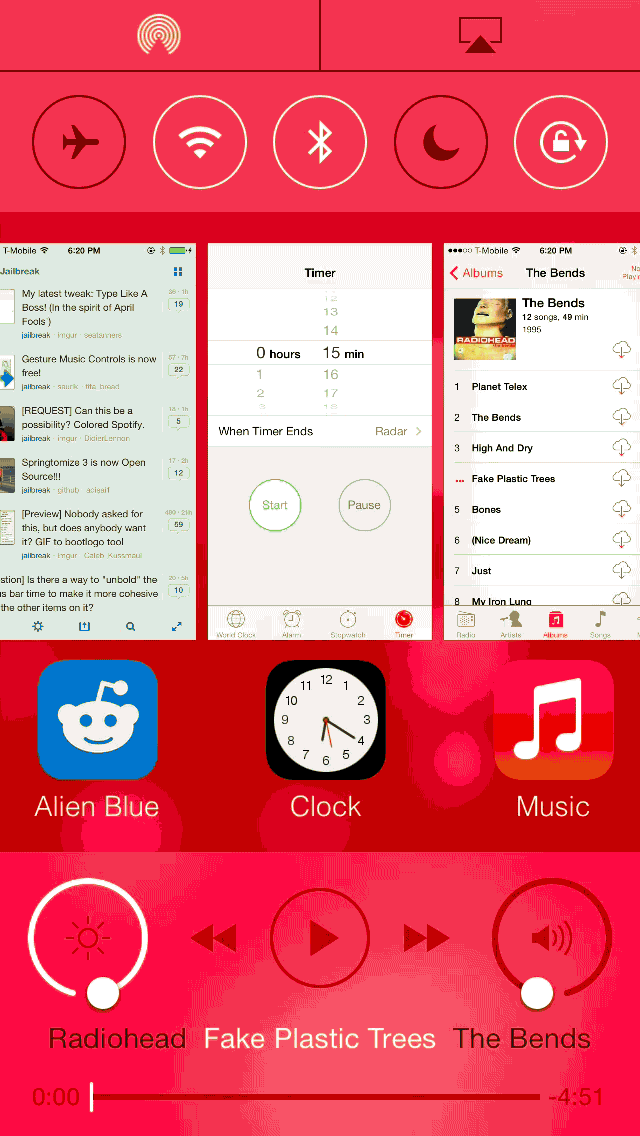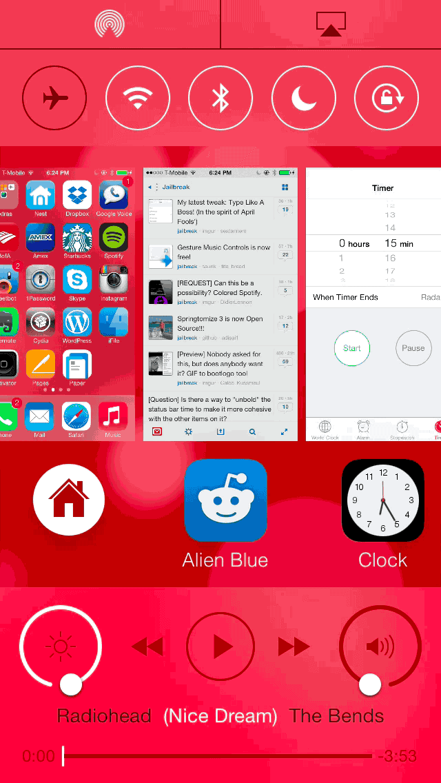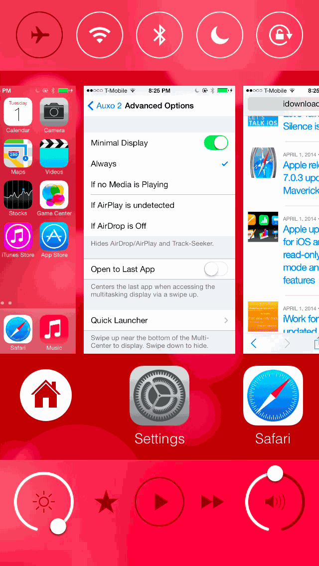 AUXO 2除了加入了方便快捷的6个后台app快速开启选择,完整后台也得到了保留与重新设计,开启手势为从屏幕中部上拉,开启后可以看到布局为顶部:开始开关;中间:后台程序缩略图,与iOS7原生无差;底部:媒体控制、音量、亮度设置与快速启动,完美解决了上拉手势与控制中心激活方式的冲突问题,而且控制中心与后台的融合省略了一步,让你的操作更加快捷高效。