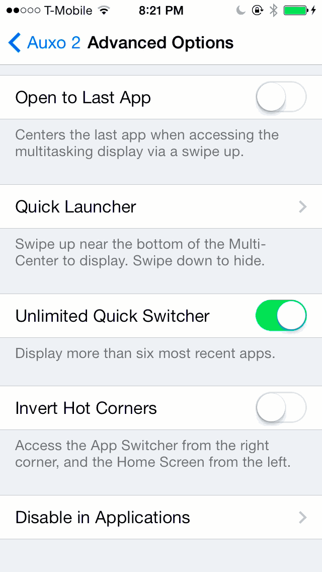 默认情况下,快速切换器允许你在最近使用的6个应用程序之间进行切换,但你可以在AUXO 2高级设置选项中,设置为允许在最近使用的所有应用程序之间进行切换。