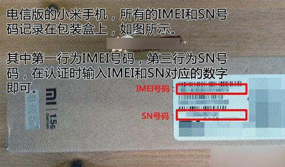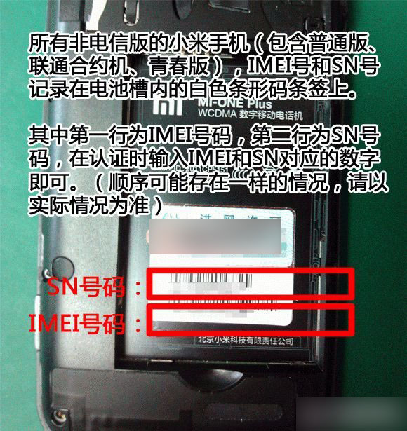 答:在小米手机包装盒背面底部的详细规格参数中,就可以找到小米手机的SN码和IMEI码,如下图所示: 如果可以拆开小米手机后盖和电池,在机身内部同样可以看到,如下图所示: >>详细