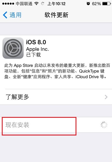 接下来就是漫长的等待了,等待iOS8更新文件下载完成之后,我们点击下方的“现在安装”,如下图所示。