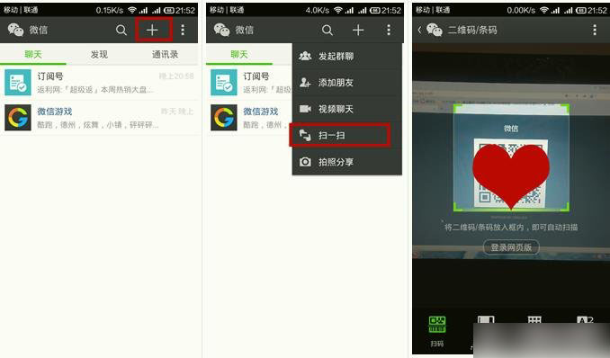 我们开启微信,单击右上角的+,选择扫一扫,对着电脑扫上一扫就可以了!
