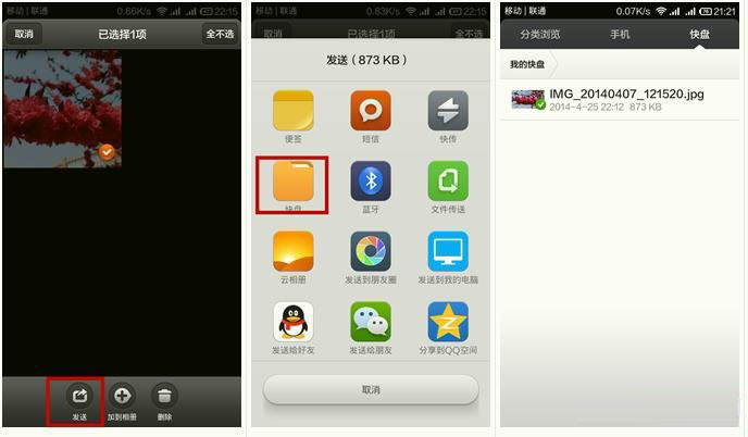 选择你要传输的文件,然后选择发送到快盘。然后去文件管理,找到了快盘的界面,就会看到刚才自己传的照片了!