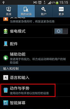 1)首先在“设置”上,点击最上面的“我的设备”,然后找到“动作与手势”按钮,点击进去,进入设置。(如下图所示)