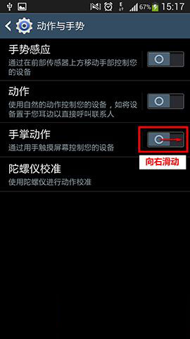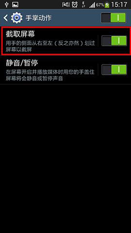 二)以上的截图比较简单,下面就让小编为大家带来三星S4还有另外一种截图方法:用手的侧面由右至左划过截屏,下面就是开启截图的方法。