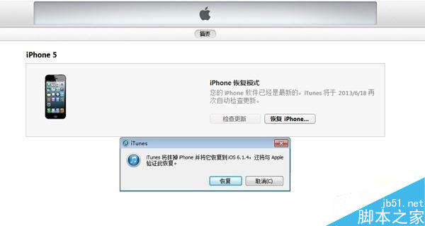 5、之后你将看到一个提示消息,你的iPhone则正处在恢复模式,然后我们从设备中选择你的iOS设备,之后点击“shift+恢复iPhone”按钮找到之前下载的IOS6.1.4的固件