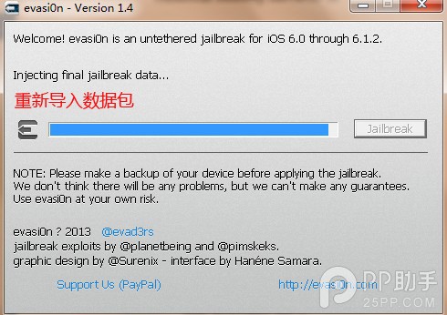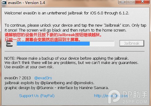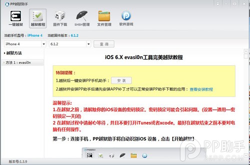 第二步:点击【开始越狱】后PP越狱助手将自动匹配iOS固件版本并弹出越狱【evasi0n】工具