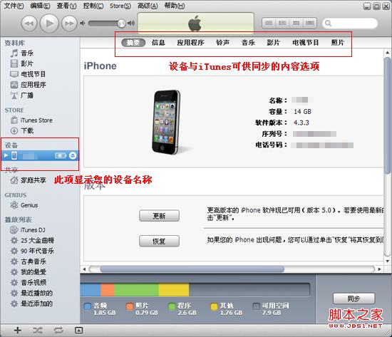 步骤5:同步应用程序。我们这边用iPhone作为使用设备。用数据线把iPhone与电脑连接上,打开 iTunes主界面,在右边【设备】选项下找到我们的iPhone名称。