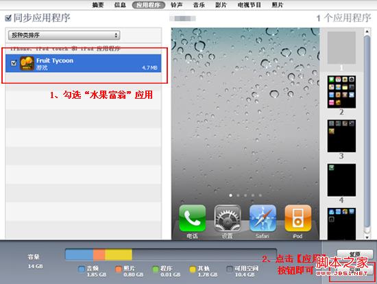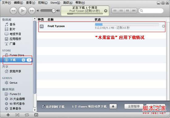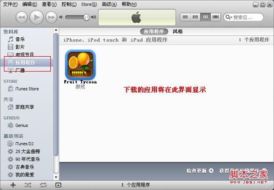 下载完成后,点击右边【应用程序】选项,可以查看刚下载的“水果富翁”的应用,我们还将知道此游戏适玩于iPhone、iPod touch和iPad。