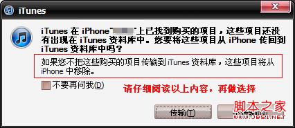 在点击【应用】按钮后,将弹出如下提示框,您需仔细阅读提示框中的内容,再进行选择。我们这里是选择了【传输】按钮,在iTunes 资料库中备份。