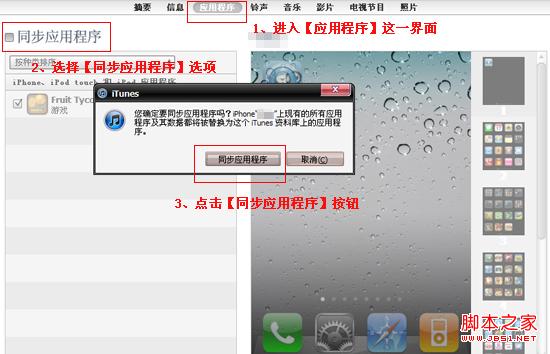 点击后,右边默认显示【摘要】界面,顶部为一些同步的名称。而我们需要进入【应用程序】界面,在点中“同步应用程序”选项框后,将弹出“是否同步信息”的对话框。