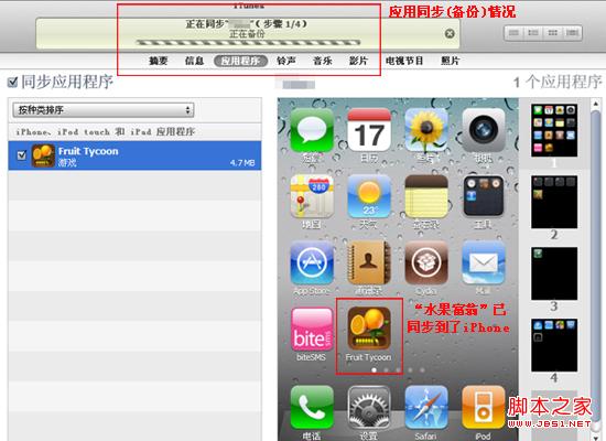 提示框对话结束后,在界面的顶部就出现了“正在同步”的信息情况,同时,从电脑上下载的“水果富翁”也同步到了我们的iPhone。