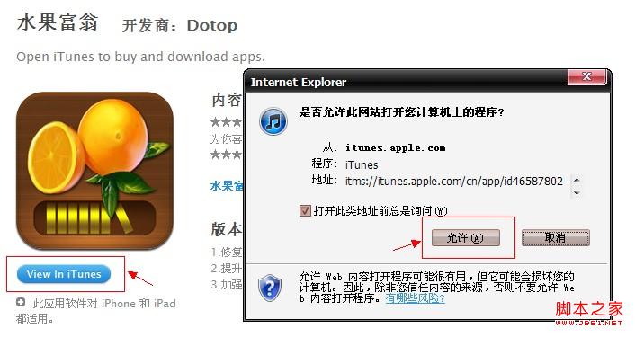 步骤2:进入官方下载页面后,点击【View In iTunes】按钮。如果您电脑里没有安装 iTunes,则提示进入iTunes 官方下载页面;如有安装则会出现如下对话框,点击【允许】桌面将弹出iTunes 界面。